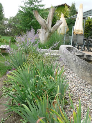 Naturnahe Gartenanlage in Vaschvitz (linkes Bild) Ein Einbaum bildet den Abschluss der Terrasse des Restaurants Kormoran "Im Jaich" mit dem wundervollen Blick auf die Insel Vilm (rechtes Bild).  | ![]()  |